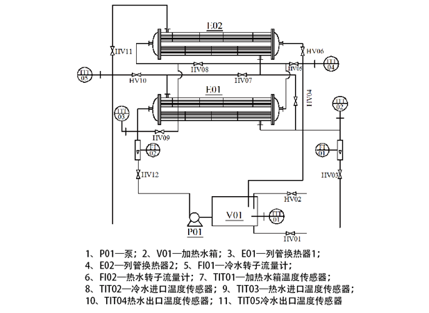列管式換熱器、水箱、泵、流量計、溫度傳感器、閥門(mén)管路若干、智能儀表、嵌入式一體化彩色觸控顯示屏。