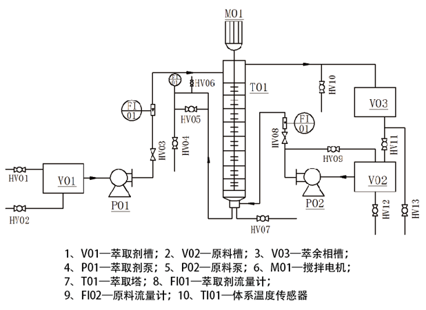 轉盤(pán)萃取塔、調速電機、萃取劑槽、原料槽、萃余相槽、原料泵、萃取劑泵、轉子流量計、溫度傳感器、不銹鋼閥門(mén)若干、智能儀表、嵌入式一體化彩色觸控顯示屏。