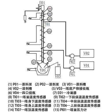 精精餾塔、原料槽、溶劑槽、原料泵、溶劑泵、塔底產(chǎn)物接收瓶、四口燒瓶、加熱套、加熱套加熱交流電源、提餾段保溫交流電源、精餾段保溫交流電源、塔頂產(chǎn)物接收瓶、溶劑回收段保溫交流電源、電磁鐵-時(shí)間繼電器、冷凝器、智能儀表、嵌入式一體化彩色觸控顯示屏。