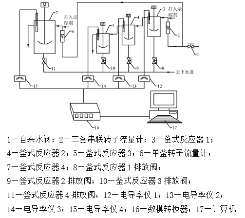 裝置主要由串聯(lián)的三個(gè)釜式反應器、單個(gè)的釜式反應器、轉子流量計、電導率儀、嵌入式一體化彩色觸控顯示屏、主機、閥門(mén)管路等組成。