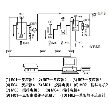 釜式反應器、電導率儀、轉子流量計、閥門(mén)管路若干、數模轉換器、計算機、打印機、智能儀表、嵌入式一體化彩色觸控顯示屏。