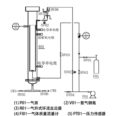 氣升式環(huán)流反應器、氣泵、氣體質(zhì)量流量計、氮氣鋼瓶、電導儀、測氧儀、壓力傳感器、不銹鋼閥門(mén)若干、智能儀表、嵌入式一體化彩色觸控顯示屏。